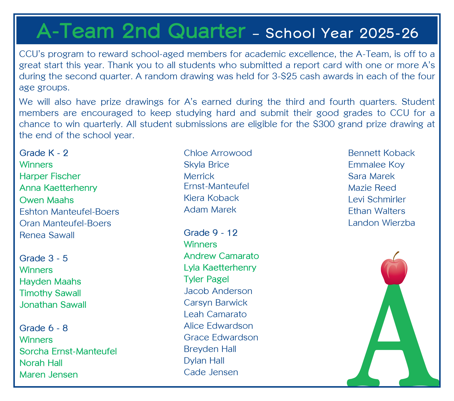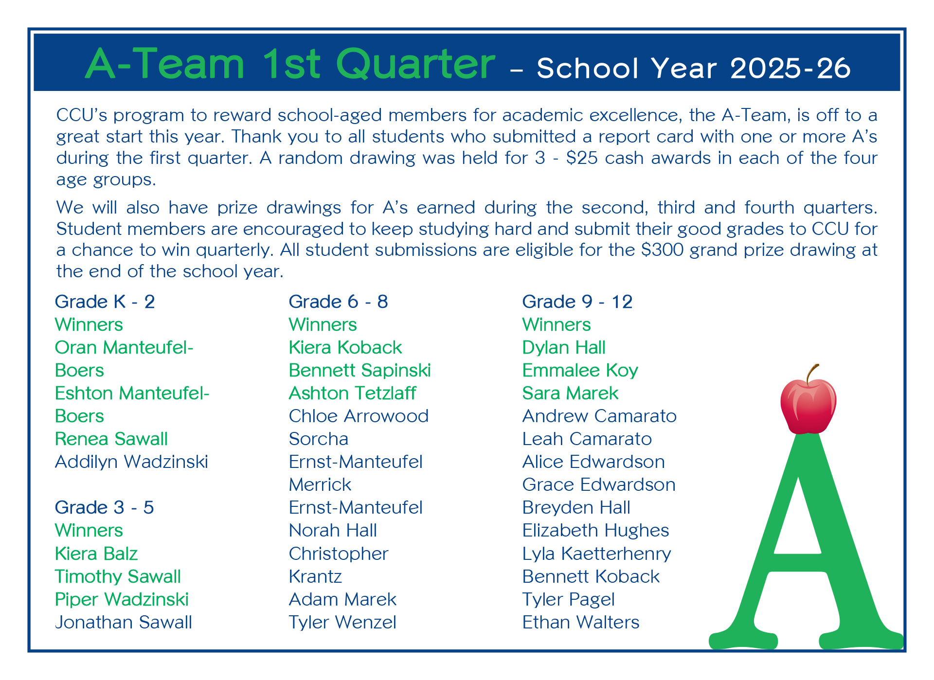 Study hard, do your best, and don’t forget to submit your good grades to CCU for a chance to WIN! Every quarter we ask any kindergarten through 12th grade student of a public, private or home school who is a CCU member to submit their report card containing one or more A’s (or equivalent score). A random drawing is held each quarter for 3 – $25 prizes in each of 4 grade groups and, at the end of the year, we draw for a $300 prize!